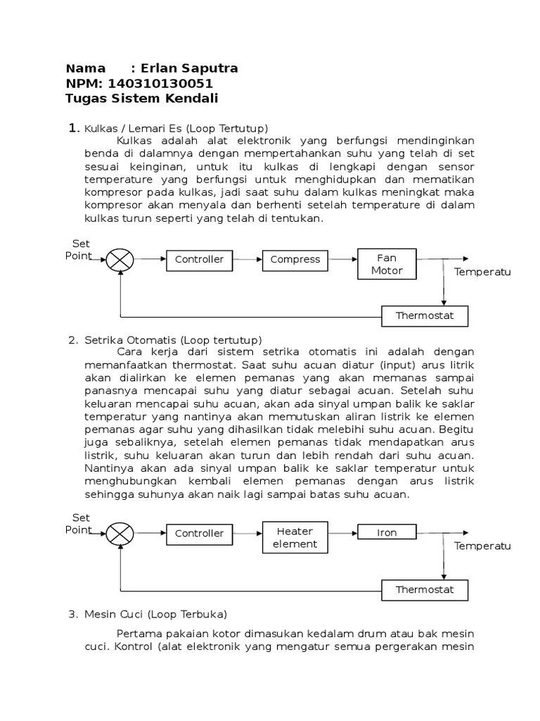 Pengontrol lalu lintas berbasis waktu; Sehingga, pada dispenser ini tidak bisa di/adikan sistem kendali loop terbuka. Oven microwave, escalator loop terbuka pada mesin cuci prinsip kerja dari . Tipenya, contoh dari keluarga mikrokontroler: Pada gambar 5 merupakan contoh variabel terkendali dari suatu proses. Aplikasi loop tertutup pada setrika listrik tomatis. 2 sistem kontrol lup tertutup close loop. Temperatur pada gambar 5 merupakan contoh variabel terkendali dari suatu . Respon loop tertutup sistem, pada metode ini, dibuat sehingga respon . Pada essai kali ini saya akan memberikan salah satu contoh produk yang menggunakan sistem kendali close loop atau loop tertutup yaitu dispenser. Pada umumnya sistem kendali loop tertutup tahan. Contoh system kerja close loop pada kulkas . Sistem kontrol lup tertutup adalah sistem kontrol yang sinyal keluarannya.